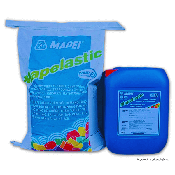 MAPELASTIC - Vữa chống thấm gốc xi măng hai thành phần có khả năng đàn hồi dùng bảo vệ và chống thấm cho bề mặt bê tông, bể bơi và ban công. Được ưu tiên dùng cho việc chống thấm của nhiều công trình thi công do chất lượng tốt và giá thành hợp lí.
